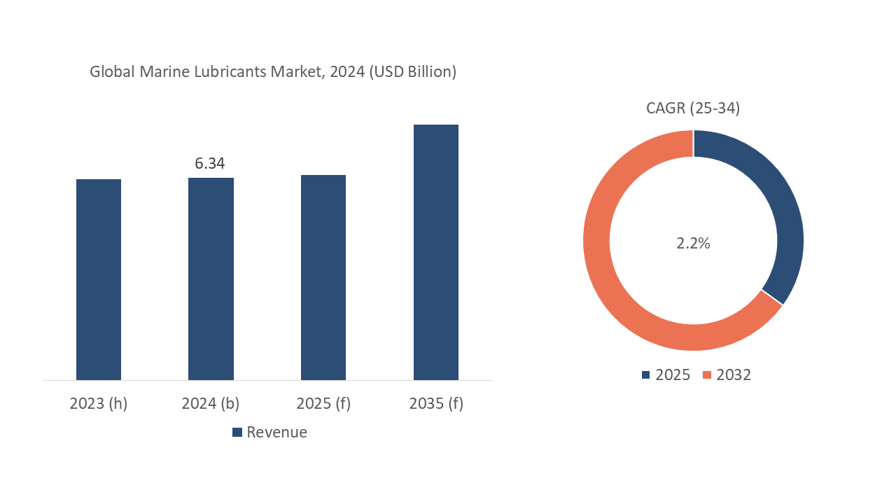 According to Novatrends Market Intelligence, the global marine lubricants Market was valued at USD 6.34 billion in 2024 and is anticipated to propel at a growth rate of 2.20% from 2025-2032. The marine lubricants market is primarily driven by the global expansion of the shipping industry, which has experienced significant growth due to rising international trade and demand for raw materials and goods. As shipping volumes increase, so does the need for efficient vessel maintenance, where marine lubricants play a crucial role in ensuring engine reliability and reducing friction and wear. Additionally, stringent environmental regulations imposed by bodies such as the International Maritime Organization (IMO) have encouraged the development of eco-friendly, biodegradable lubricants that help reduce harmful emissions and meet compliance standards.