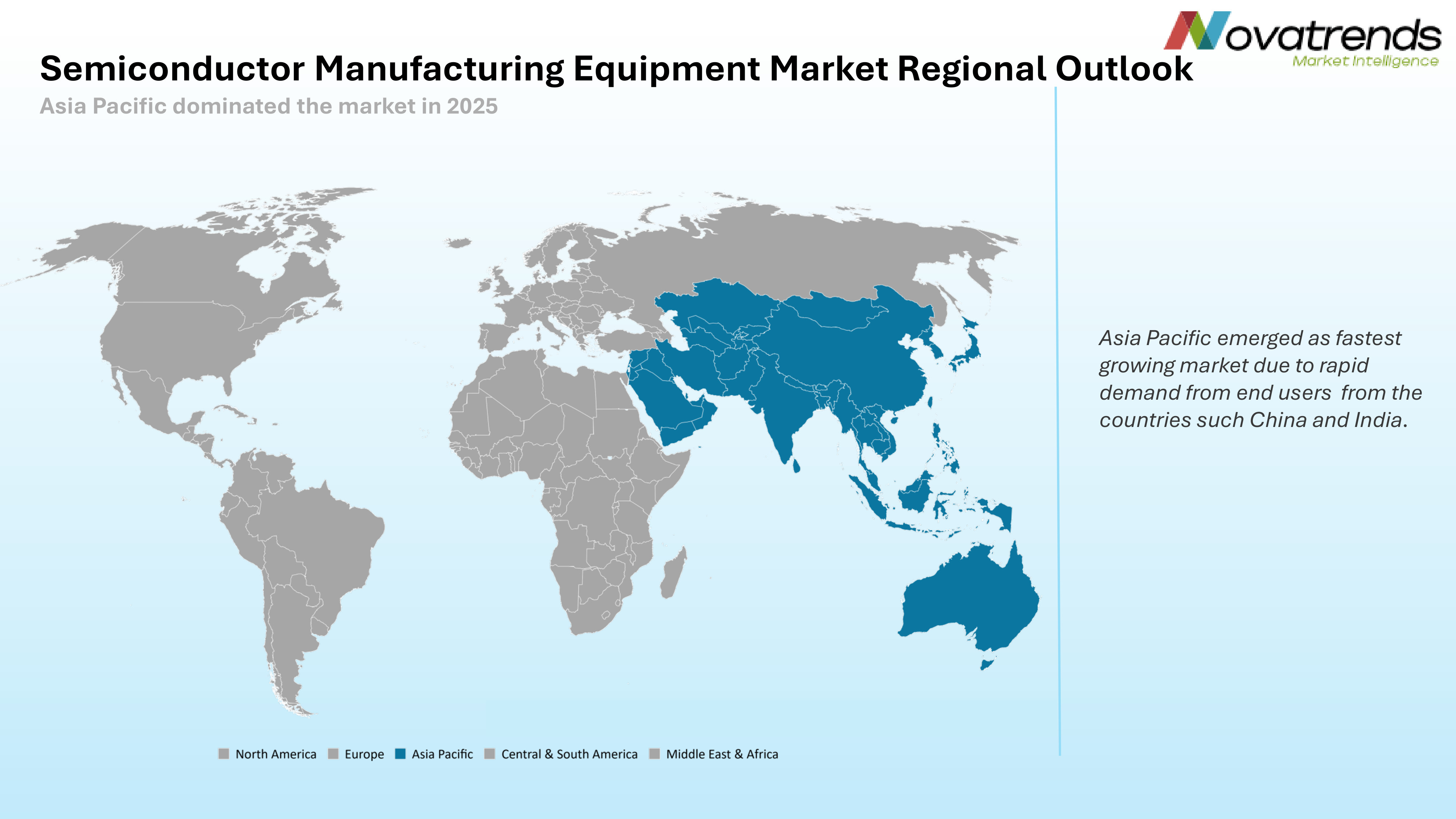 According to Novatrends Market Intelligence, the Global Semiconductor Manufacturing Equipment Market was valued at USD 121.46 billion in 2025 and is anticipated to propel at a growth rate of 9.78% from 2026-2036. The semiconductor manufacturing equipment market is a critical component of the global electronics supply chain, supporting the production of advanced chips used in computing, telecommunications, automotive electronics, and artificial intelligence systems. Rising demand for high-performance processors, memory devices, and specialized semiconductors is driving investments in new fabrication facilities worldwide. Governments and private sector players are prioritizing semiconductor self-sufficiency through capacity expansion initiatives. Technological progress toward smaller process nodes and advanced packaging techniques is increasing equipment complexity and capital intensity. Asia Pacific continues to dominate fabrication capacity, while North America and Europe are strengthening domestic semiconductor ecosystems through large-scale manufacturing incentives and strategic industry investments.